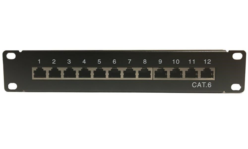 Patch panel osazený 12 porty s Cat.6, vhodný pro narážeč typu LSA. Vnitřní kryt patch panelu dovoluje manipulaci v malé skříni bez rizika vytáhnutí kabelu ze zářezového konektoru. Vyvazovací koncovky dovolují pevně přitáhnout kabelový vývod k panelu. Součástí zařízení je zemnící přívod a napojení stínění přímo na PCB.