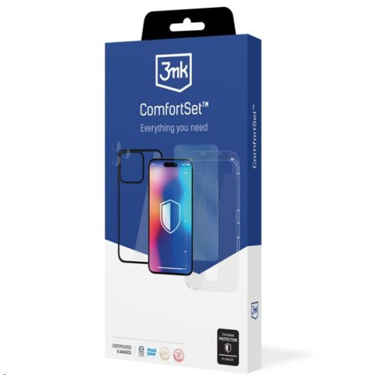 Comfort Set 4in1 je profesionální sada pro samostatné provedení komplexní ochrany chytrého telefonu. Obsahuje vlajkové produkty 3mk Protection: obal Satin Armor Case+, hybridní sklo Resilient Glass na objektiv foťáku Lens Protection, tvrzené sklo na displej telefonu s tvrdostí 9H a jednorázový aplikátor pro instalaci skla. Díky sadě Comfort Set 4in1 ochráníte svůj chytrý telefon, aniž byste museli někam chodit. Navíc se nebudete ani příliš trápit s instalací skla – je to velmi jednoduché a zvládnete to za několik minut!