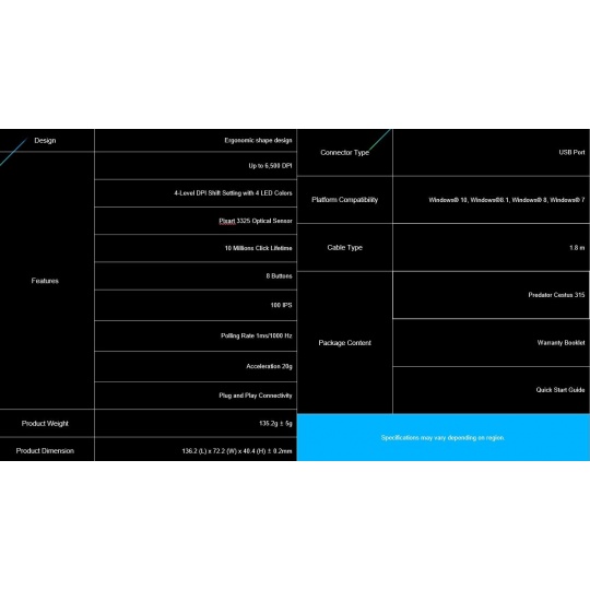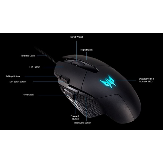 ACER Predator CESTUS 315 - herní myš, 4 levels DPI 800-6500dpi, Pixart 3325 senzor, IPS/speed 100, 8 tlačítek