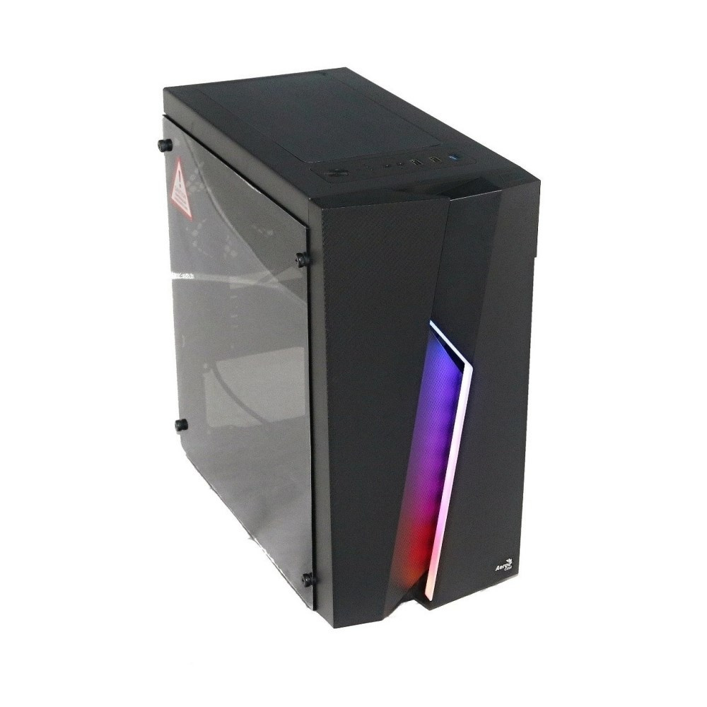 Počítačová skříň skleněným bočním krytem a RGB podsvětlením panelu.