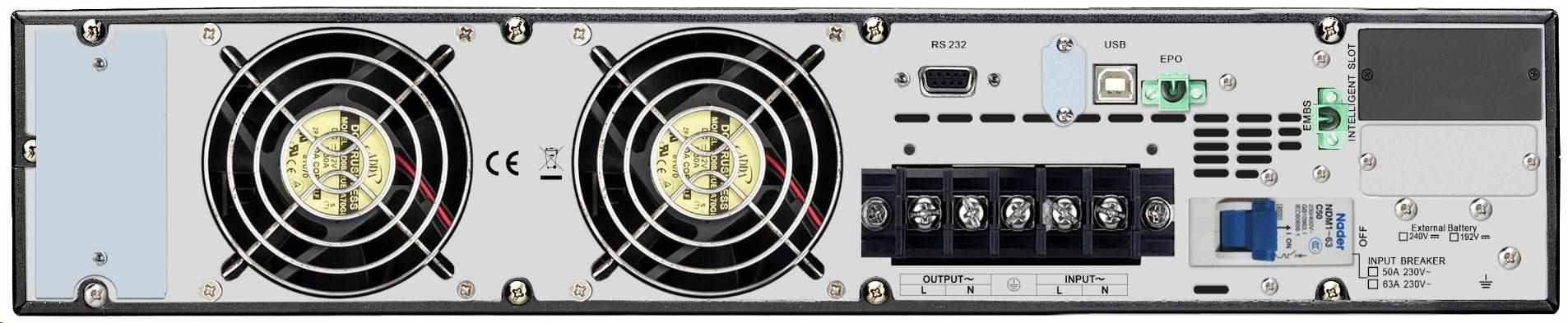 Použití:Server; Provedení:Rackmount; Zdánlivý výkon VA:6000; Výška v Racku:4U; Topologie:On-Line; Fáze (Vstup/Výstup):1:1; Komunikace:USB, RS232; Možnosti:Volitelně Management karta, EPO konektor; Typ výstupu:Svorkovnice.... více
