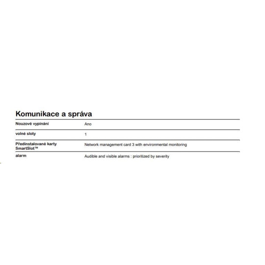 | Dodávka obsahuje | CD se softwarem, Disk CD s dokumentací, Instalační příručka, Záruční karta EPO Terminal block, Teplotní čidlo, Kabel USB, Kabel RJ45-DB9, Kabel Console-DB9, 2ks kabel 2m C19-C20, Odnimatelná podpora, Rack mont úchyty |