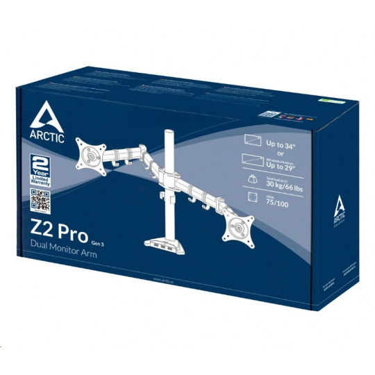 The ARCTIC Z2 Pro monitor arm supports the latest ultrawide monitors (up to 29 inches) with ease. Classic 16:9 monitors are also compatible (up to 34 inches). The Z2 Pro supports a total load of 15 kg/33 lbs.