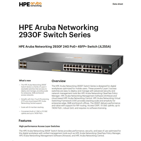 Řada přepínačů HPE Aruba Networking 2930F je navržena pro digitální pracoviště optimalizovaná pro mobilní uživatele. Tyto výkonné přístupové přepínače vrstvy 3 se snadno nasazují a spravují pomocí pokročilých bezpečnostních a nástrojů pro správu sítě, jako jsou HPE Aruba Networking ClearPass Policy Manager, HPE Aruba Networking Management Software (AirWave) a cloudové řešení HPE Aruba Networking Central. HPE Aruba Networking Virtual Switching Framework (VSF) poskytuje škálovatelnost stohování a jednoduchost pro podnikové okraje sítě, SMB a pobočky. Model 2930F nabízí výkon a hodnotu díky podpoře směrování RIP, Access OSPF, 10GbE uplinkům, až 740 W PoE+, pokročilému QoS a nevyžaduje žádné softwarové licence.