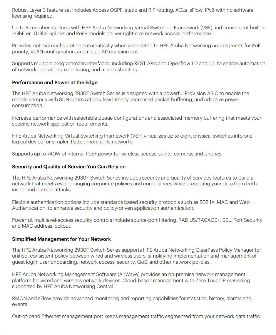 Řada přepínačů HPE Aruba Networking 2930F je navržena pro digitální pracoviště optimalizovaná pro mobilní uživatele. Tyto výkonné přístupové přepínače vrstvy 3 se snadno nasazují a spravují pomocí pokročilých bezpečnostních a nástrojů pro správu sítě, jako jsou HPE Aruba Networking ClearPass Policy Manager, HPE Aruba Networking Management Software (AirWave) a cloudové řešení HPE Aruba Networking Central. HPE Aruba Networking Virtual Switching Framework (VSF) poskytuje škálovatelnost stohování a jednoduchost pro podnikové okraje sítě, SMB a pobočky. Model 2930F nabízí výkon a hodnotu díky podpoře směrování RIP, Access OSPF, 10GbE uplinkům, až 740 W PoE+, pokročilému QoS a nevyžaduje žádné softwarové licence.