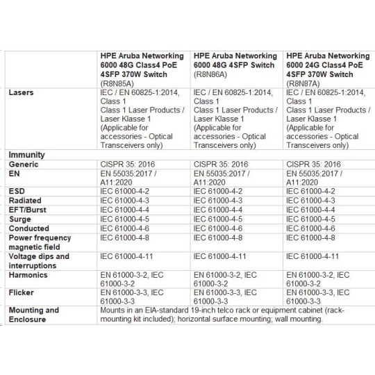 | Emissions | VCCI-CISPR 32, Class A; CNS 13438; ICES-003 Issue 6 Class A; FCC CFR 47 Part 15, Class A; EN 55032: 2015 +AC:2016 / CISPR-32, Class A |