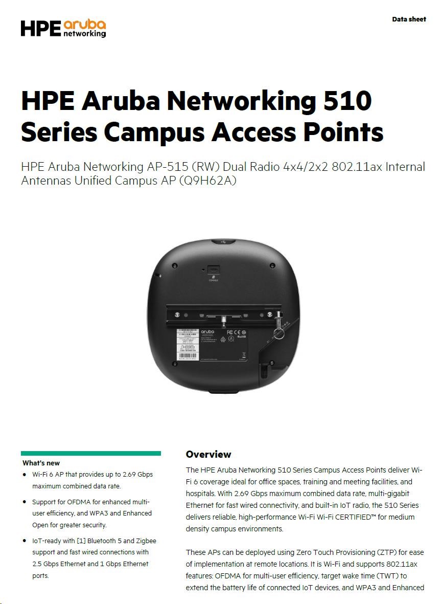 HPE Aruba Networking AP-515 (RW)AP-515 (RW) Dual Radio 4x4:4 + 2x2:2 802.11ax Internal Antennas Unified Campus AP Q9H62A
