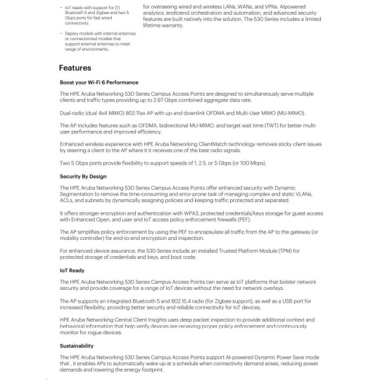 | Very High Wi-Fi 6 (802.11ax) Performance With Dual Radios And Green AP Energy Efficiency Aruba Wi-Fi 6 access points provide high-performance connectivity for any organization experiencing growing numbers of IoT and mobility requirements. With a maximum aggregate data rate of 3.55 Gbps (HE80/HE40), the Aruba 530 Series deliver the speed and reliability needed for any enterprise. | |
