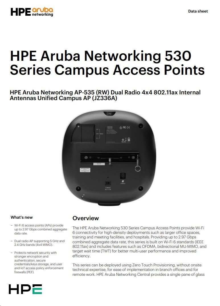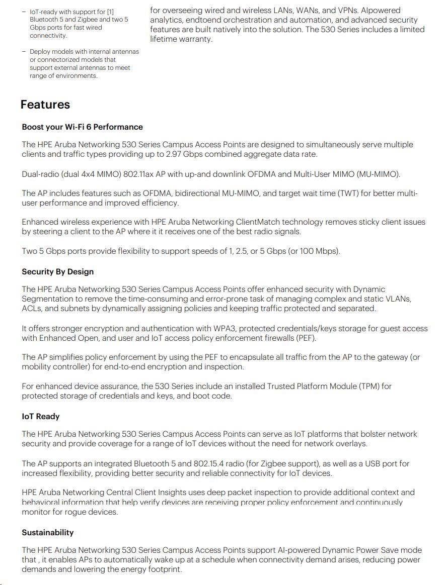 | Very High Wi-Fi 6 (802.11ax) Performance With Dual Radios And Green AP Energy Efficiency Aruba Wi-Fi 6 access points provide high-performance connectivity for any organization experiencing growing numbers of IoT and mobility requirements. With a maximum aggregate data rate of 3.55 Gbps (HE80/HE40), the Aruba 530 Series deliver the speed and reliability needed for any enterprise. | |