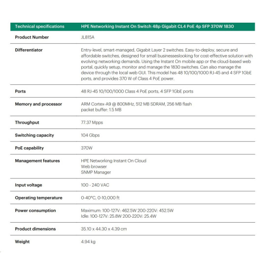 HPE Networking Instant On Switch 48p Gigabit CL4 PoE 4p SFP 370W 1830 (JL815A)