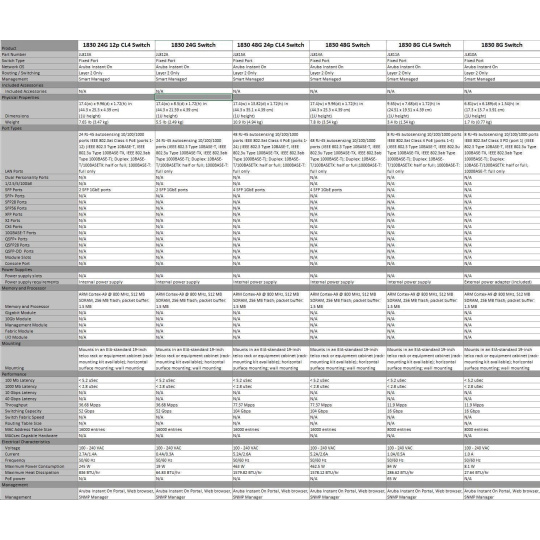 Notes: 1Acoustics measured in 23°C semi-anechoic chamber with a loading of 100% traffic and (for JL813A and JL815A) 50% PoE on all ports. Measured in accordance with ISO 7779. Declared in accordance with ECMA-109:2010. Values presented are the Declared A-Weighted Sound Power Level (LWAd) and the mean Bystander A-Weighted Sound Pressure Level (LpAm)