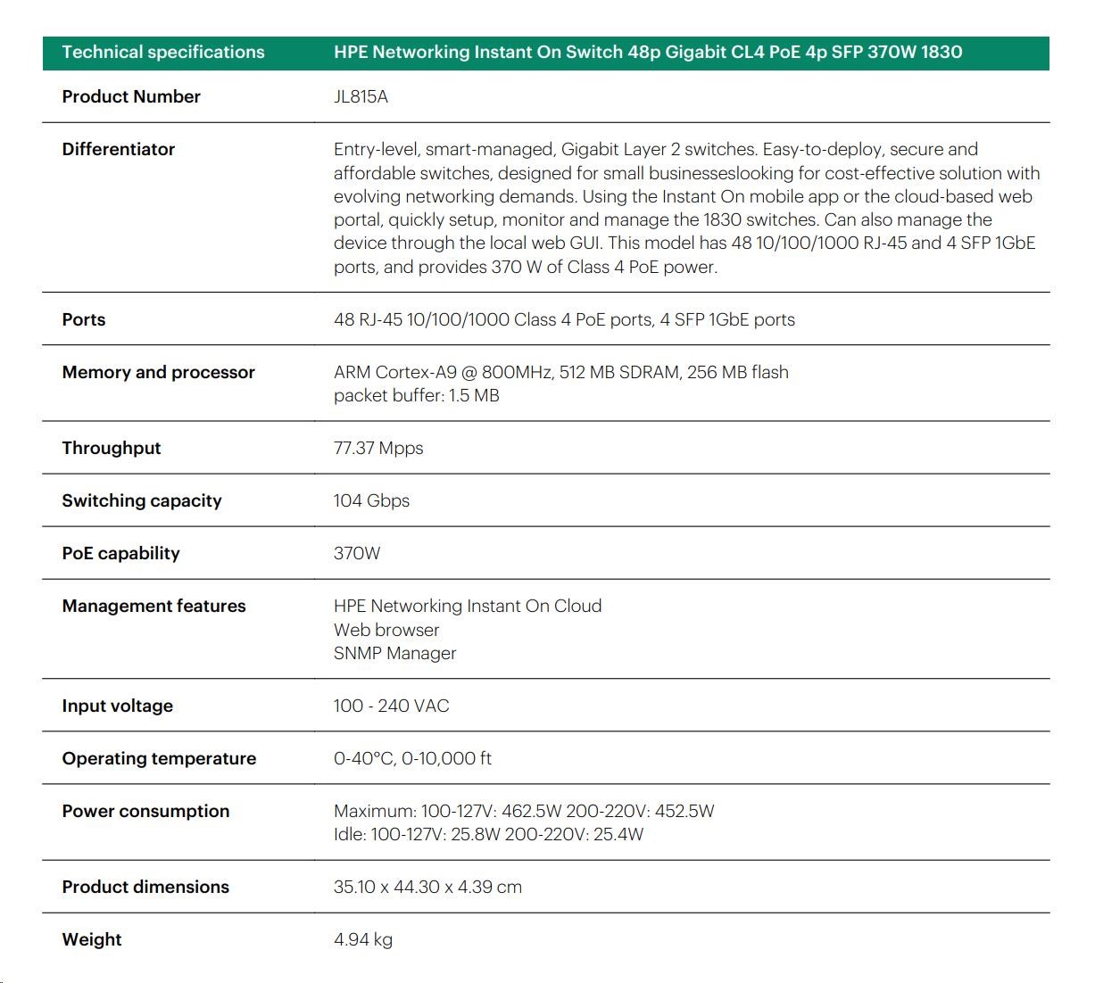 HPE Networking Instant On Switch 48p Gigabit CL4 PoE 4p SFP 370W 1830 (JL815A)