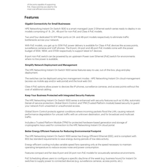 | Aruba Instant On 1830 8G Switch (JL810A) | Aruba Instant On 1830 8G 4p Class4 PoE 65W Switch (JL811A) | Aruba Instant On 1830 24G 2SFP Switch (JL812A) | Aruba Instant On 1830 24G 12p Class4 PoE 2SFP 195W Switch (JL813A) | Aruba Instant On 1830 48G 4SFP Switch (JL814A) | Aruba Instant On 1830 48G 24p Class4 PoE 4SFP 370W Switch (JL815A) | ||||