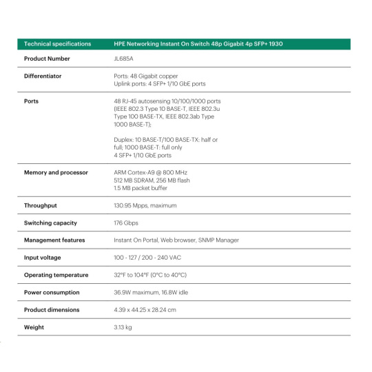 HPE Networking Instant On Switch 48p Gigabit 4p SFP+ Fanless 1930 JL685A (fanless)