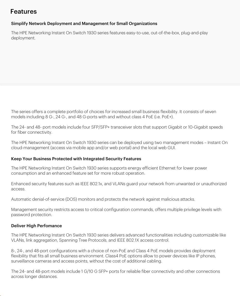 | Transceivers | Aruba Instant On 1G SFP LC SX 500m OM2 MMF Transceiver (R9D16A ) Aruba 1G SFP LC LX 10km SMF Transceiver (J4859D) Aruba Instant On 1G SFP RJ45 T 100m Cat5e Transceiver (R9D17A) Aruba Instant On 10G SFP+ LC SR 300m OM3 MMF Transceiver (R9D18A) Aruba 10G SFP+ LC LR 10km SMF Transceiver (J9151E) | |