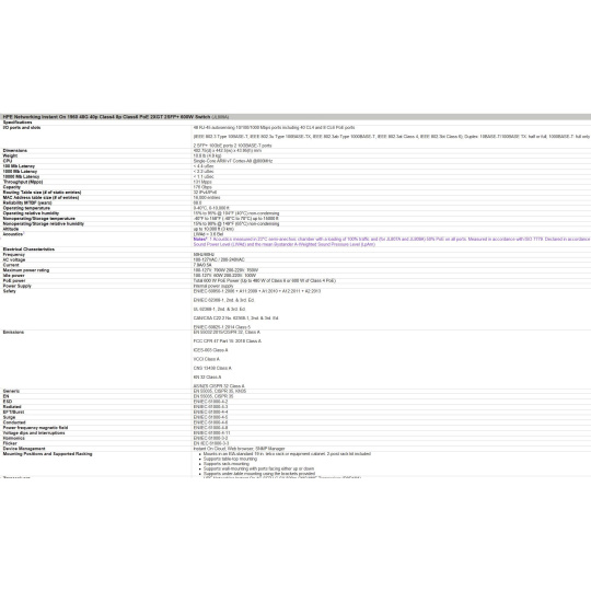 | Notes1: 1 Acoustics measured in 23°C semi-anechoic chamber with a loading of 100% traffic and (for JL807A and JL809A) 50% PoE on all ports. Measured in accordance with ISO 7779. Declared in accordance with ECMA-109:2010. Values presented are the Declared A-Weighted Sound Power Level (LWAd) and the mean Bystander A-Weighted Sound Pressure Level (LpAm) | |