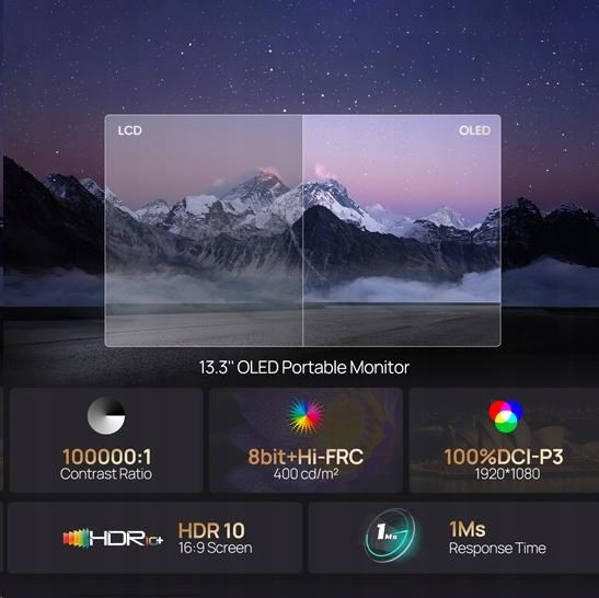 Panel OLED v monitoru Arzopa A3C Pro poskytuje 8bitovou barevnou hloubku a realistickou reprodukci obrazu. Vysoký jas 400 nitů a nekonečný kontrast vám umožní vychutnat si dokonalou viditelnost i ve světlých místnostech. Díky 100% pokrytí barevného prostoru DCI-P3 a podpoře HDR10 je navíc obraz plný detailů a barvy živé a přirozené. Jedná se o skvělou volbu pro grafiky, fotografy a všechny, kteří ocení kvalitu obrazu na nejvyšší úrovni. Díky tak široké paletě barev monitor dokonale reprodukuje světlé i tmavé scény.