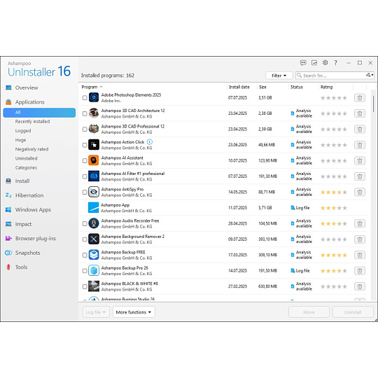 Ashampoo UnInstaller 16 nabízí komplexní řešení pro všechny vaše potřeby odinstalace v jednom robustním softwarovém balíčku. Díky možnostem forenzní analýzy můžete odstranit i starší podporované programy bez zanechání stop, bez ohledu na to, zda byla jejich instalace monitorována. Pokročilé čisticí moduly a nový Optimalizátor registru nabízejí znatelné zlepšení rychlosti a čistoty vašeho počítače. Software navíc obsahuje výkonné nástroje, jako je Crash Analyzer, který poskytuje přehled o systémových problémech a pomáhá s jejich řešením. Všechny tyto funkce jsou integrovány do rychlejší, stabilnější a modernější verze!