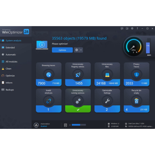 S novým programem Ashampoo WinOptimizer 28 získáte automaticky nejlepší zážitek z práce s Windows. Jeho nová automatizace zrychluje, čistí a ladí vaše aplikace. Nechte svůj počítač plynule přizpůsobit vašim potřebám pomocí prioritizace procesů, automatického čištění dočasných souborů a vlastních konfigurací profilů na základě nového nástroje Profile Booster. Ať už jde o hraní her, práci nebo prohlížení webu, maximalizujte výkon systému nebo šetřete prostředky, volba je na vás. Nový nástroj Crash Analyzer nabízí hluboký pohled na pády systému a jejich příčiny, zatímco čtyři pokročilé čističe zajišťují soukromí a poskytují údržbu systému. Díky vylepšené správě paměti dokáže nyní WinOptimizer využít více prostředků k provádění komplexních analýz téměř okamžitě!