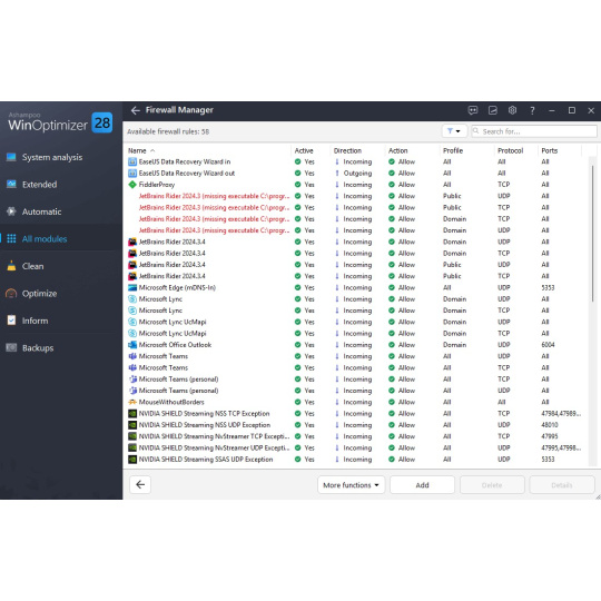 Máte přehled o tom, které aplikace mají přístup k internetu? Zajímá vás, co přichází a odchází a která pravidla mohou být zastaralá? S novým Správcem brány Firewall můžete plně kontrolovat síťový provoz. Snadno zjistíte, co je povoleno a kde by bylo třeba zasáhnout. Díky základnímu, standardnímu a pokročilému režimu, inteligentním filtrům a filtru pro vyhledávání deaktivovaných nebo chybných pravidel rychle zjistíte, které aplikace mohou odesílat nebo přijímat data, a můžete rozhodnout, co má být povoleno nebo blokováno. Převezměte zpět kontrolu nad provozem svého počítače pouhými několika kliknutími.