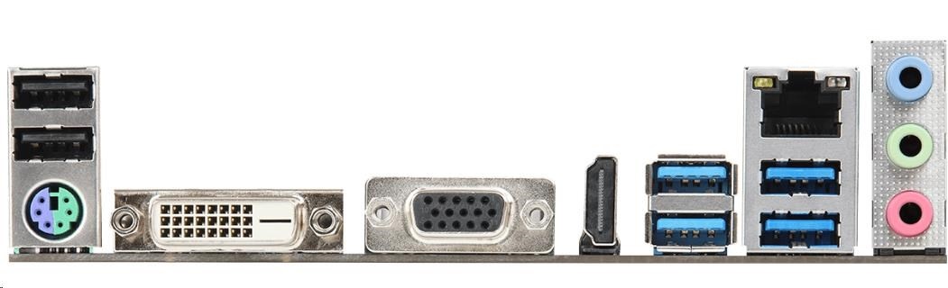 Rear panel I/O | - 1 x PS/2 Mouse/Keyboard Port - 1 x D-Sub Port - 1 x DVI-D Port - 1 x HDMI Port - 2 x USB 2.0 Ports (Supports ESD Protection) - 4 x USB 3.1 Gen1 Ports (Supports ESD Protection) - 1 x RJ-45 LAN Port with LED (ACT/LINK LED and SPEED LED) - HD Audio Jacks: Line in / Front Speaker / Microphone |