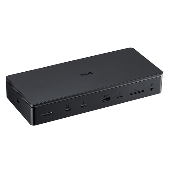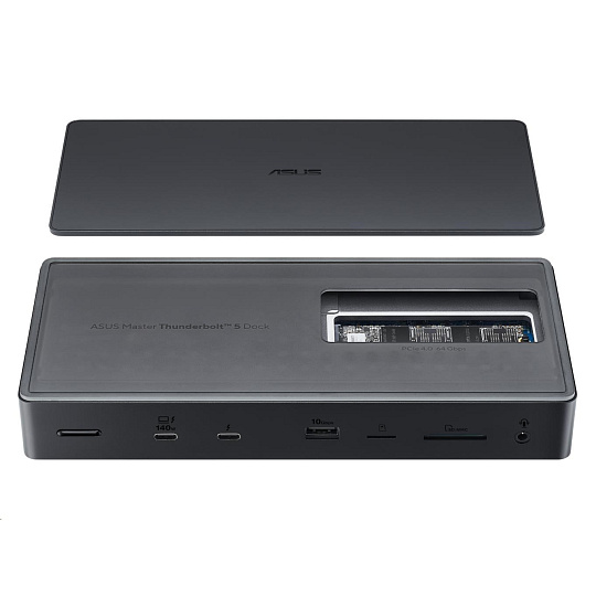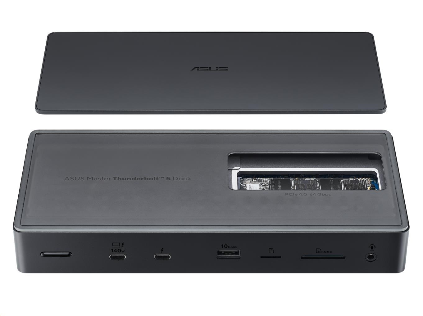 ASUS Master Thunderbolt 5 Dock je dokovací stanice 13 v 1 navržená pro tvůrce, která jim umožňuje proměnit svůj notebook ve výkonnou pracovní stanici pomocí jediného připojení kabelu. Dokovací stanice je schopna podporovat až tři 4K displeje, rychlost přenosu dat super 80 Gbps přes tři Thunderbolt 5, číst dvě paměťové karty a dokonce obsahuje slot SSD pro další úložiště. Vestavěné LED diody na spodní straně zařízení nabízejí nastavitelné okolní osvětlení, které dodává futuristickou estetiku každému kreativnímu prostoru.