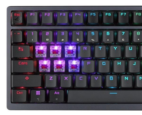 • Mechanické spínače ROG NX vyměnitelné za provozu: Předem namazané spínače pro hladší cvakání a eliminaci odskakování; rychlé ovládání a vyladěné křivky síly ROG poskytují skvělý pocit a konzistenci kláves