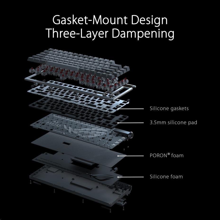 • Jedinečný design uchycení těsnění: Silikonový držák těsnění se třemi vrstvami tlumící pěny v kombinaci poskytují bezkonkurenční zážitek z psaní