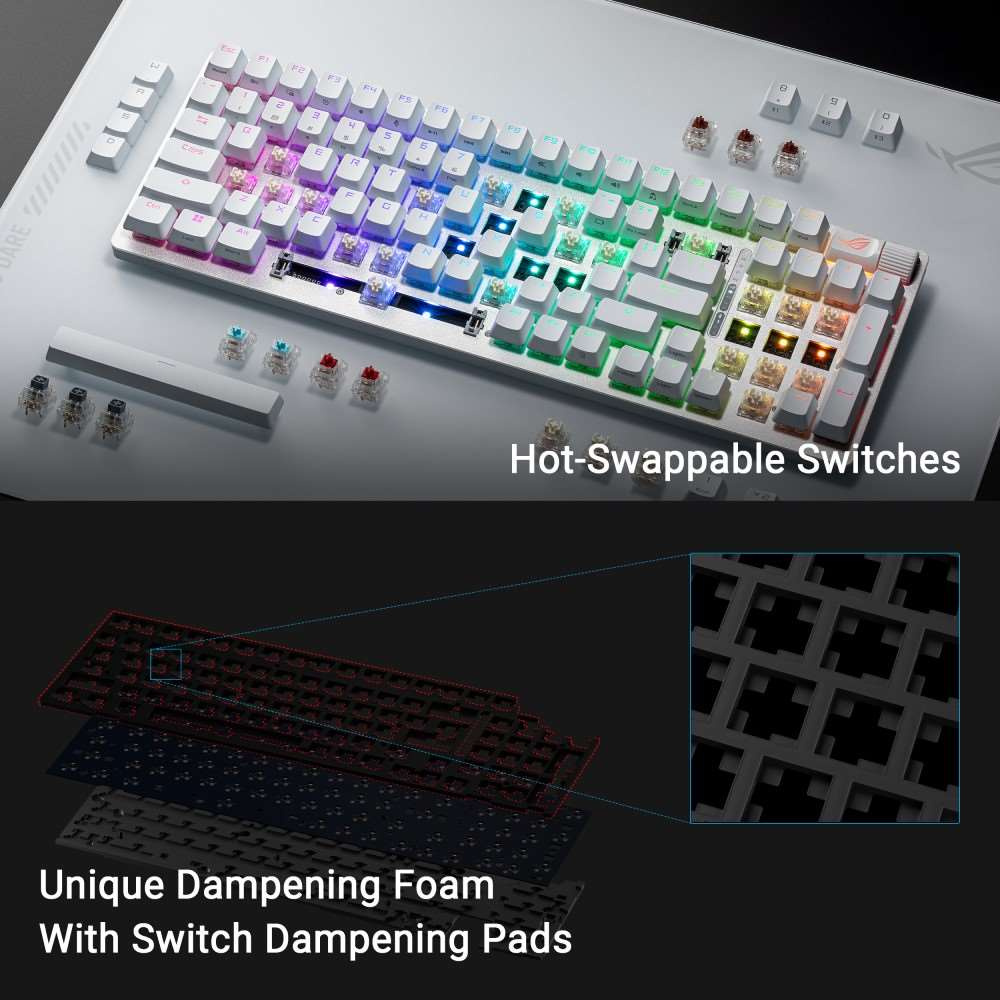 - Vylepšené možnosti psaní: Předem namazané stabilizátory klávesnice produkují menší tření pro hladší stisk kláves a stabilitu pro delší klávesy; odolné krytky kláves ROG PBT doubleshot nebo krytky kláves ABS s UV vrstvou nabízejí prvotřídní pocit a odolnost proti lesku