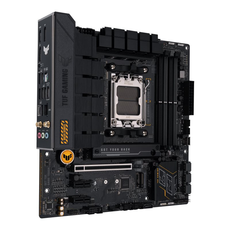 ASUS TUF GAMING B650M-E WIFI takes all the essential elements of the latest AMD Ryzen 7000-series processors and combines them with game-ready features and proven durability. Engineered with military-grade components, an upgraded power solution and a comprehensive cooling system, this motherboard goes beyond expectations with rock-solid and stable performance for marathon gaming. TUF GAMING motherboards also undergo rigorous endurance testing to ensure that they can handle conditions where others may fail. Aesthetically, this model incorporates rugged off-black and geometric design elements to reflect the dependability and stability that defines the TUF GAMING series.