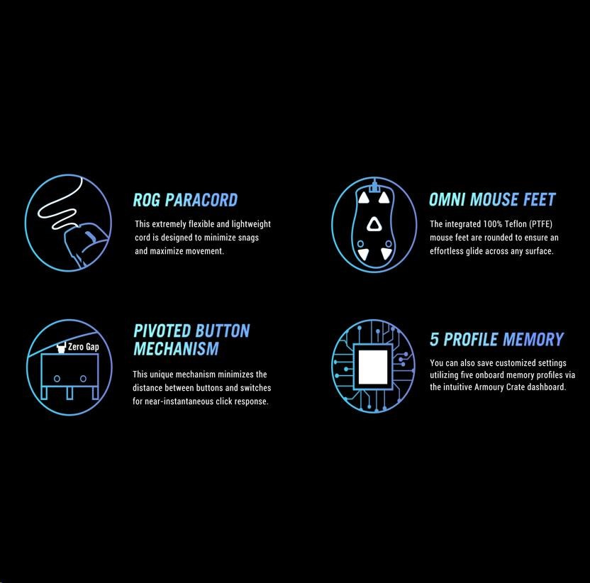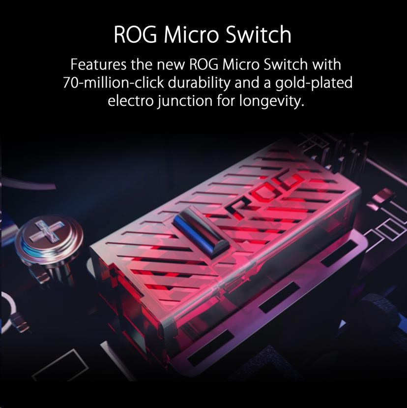 - ROG Micro Switches - The new ROG Micro Switches feature a 70-million-click lifespan and a gold-plated electro-junction to improve durability. Strict ROG manufacturing standards ensure that each individual switch is inspected and sorted, pairing left and right switches to keep force deviation within +/- 5 gram-force for a consistent click feel.