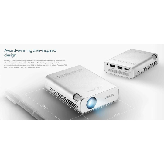 ASUS ZenBeam E1R mini LED projector – 200 LED lumens, WVGA (854x480) resolution, automatic portrait projection mode, built-in battery for up to 4-hour portable video playback , power bank, USB Type-A, HDMI