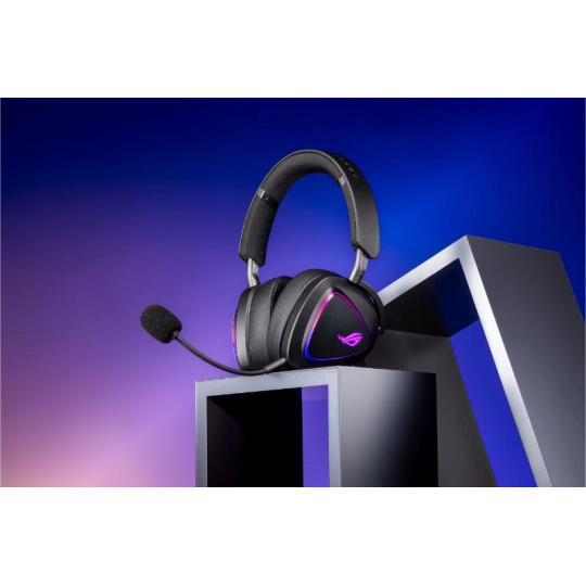 Bezdrátová herní náhlavní souprava ve třech režimech s ROG SpeedNova, 50mm drivery s titanovou membránou a vytříbeným zvukem, 10mm super širokopásmový mikrofon, DualFlow Audio, výdrž baterie až 110 hodin, lehký design 318 g, plus RGB osvětlení ASUS Aura Sync