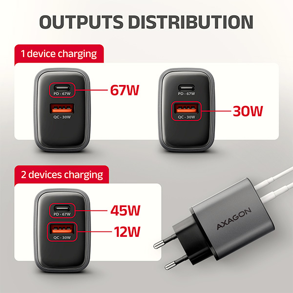 AXAGON ACU-PQ67, GaN nabíječka do sítě 67W, výstup USB-A + USB-C, PD3.0/PPS/QC4+/SFC2.0/Apple