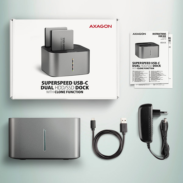 AXAGON ADSA-DC, USB-C 5Gbps - 2x SATA 6G 2.5"/3.5" SSD/HDD CLONE DUAL dokovacia stanica