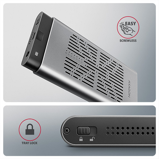 Proti náhodnému otevření chrání box mechanický zámek na předním panelu. Po posunutí zámku do odemčené polohy zatlačte na čelní část a vnitřní modul se automaticky vysune. Díky tomu disky snadno a rychle vyměníte a můžete box pohodlně využít i pro migraci dat nebo testování.