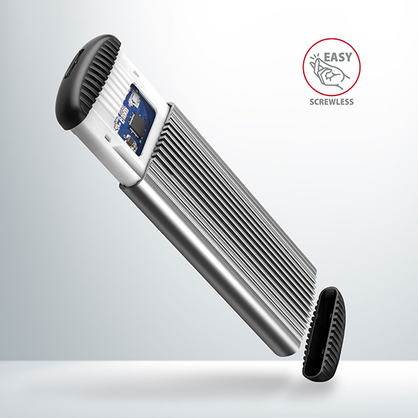 Bezšroubkové otevírání boxu usnadňuje montáž i demontáž M.2 SSD disku. Výměna disků je rychlá a snadná a rozšiřuje tak možnosti využití boxu např. pro migraci dat, testování atd.