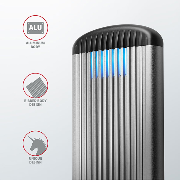 Žebrovaný design těla a kovový plášť boxu zajistí velice dobré chlazení vloženého M.2 SSD disku. Prodlužuje se tak jeho životnost a také je zamezeno zpomalování rychlosti disku tzv. „Thermal Throttling“. Robustní tělo boxu také zajistí dostatečnou ochranu disku.
