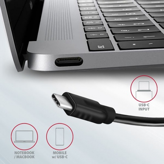 • Připojovací USB konektor typu C male (samec) umístěn na napevno uchyceném 13 cm kabelu.