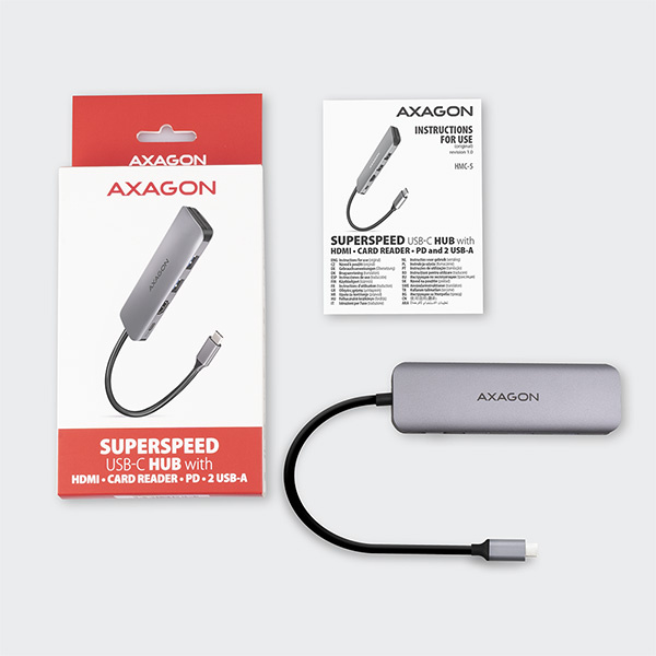Multiportový USB-C 3.2 Gen 1 hub AXAGON HMC-5 rozšíří Váš notebook, počítač nebo telefon o čtveřici portů a čtečku paměťových karet SD / microSD. Přes oboustranný USB-C konektor snadno a rychle připojíte k počítači dvě USB zařízení, čtečku karet a HDMI zobrazovač současně. Zároveň získáte možnost napájení notebooku pomocí technologie Power Delivery. USB-C hub vám tak poskytne jednoduchou a skladnou dokovací stanici 5v1 k notebooku jako je například MacBook Pro.
