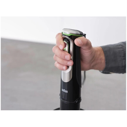 Chystáte se připravovat jemné smoothie nebo ovocné pyré? Stačí stisknout tlačítko regulace rychlosti pouze lehce. Požadujete po tyčovém mixéru ten nejvyšší výkon? Pak použijte silnější stisk a mixér se hravě vypořádá i se zmraženými potravinami. Ovládání mixéru Braun tak s inteligentním systémem Advanced SmartSpeed zvládnete i pouhou jednou rukou a i při vysokých otáčkách máte přístroj stále pod kontrolou. Navíc díky měkké rukojeti s protiskluzovým povrchem padne tyčový mixér MultiQuick 9 tak akorát do ruky.