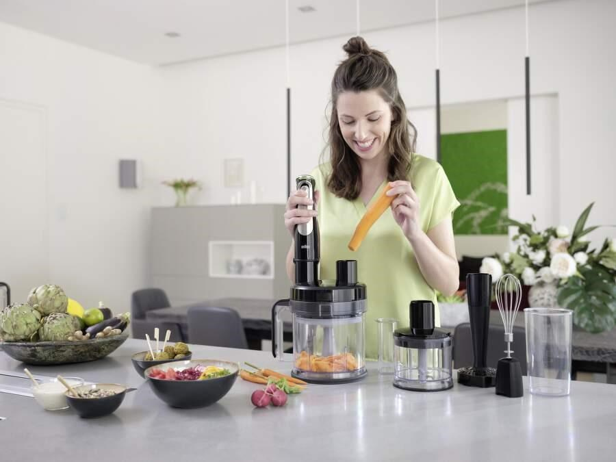 Pomocí tyčového mixéru Braun MultiQuick 9 dosáhnete ve své kuchyni doslova revoluce. Nejen, že se přístroj velice snadno a intuitivně ovládá, ale zároveň nahradí mnoho dalších spotřebičů a tím tak šetří váš čas i místo v kuchyni. K tomu navíc disponuje neobyčejným příkonem 1200 W. Tyčový mixér Braun MQ9195XLI dovede bez obtíží mixovat, šlehat, sekat, pasírovat, hníst, drtit, krájet, strouhat, mlít nebo krájet suroviny na kostičky či hranolky. Zkrátka s ním navaříte cokoliv si usmyslíte!