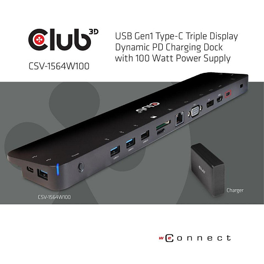 CSV-1564W100 - The Club-3D USB 3.2 Gen1 C Triple Display Dynamic PD Charging Dock is an integrated solution combining Video, Data, Power, Ethernet and Audio especially for frequent travellers. The Three different Video ports(HDMI™, DisplayPort™, VGA) allow you to enjoy 3 different images or videos on 3 different displays simultaneously under MST mode. The USB Type A ports and USB Type C data port allow you to connect multiple USB devices to the host. The USB Type C charging port allows you to provide power for this Dock and can charge the host PC at the same time by connecting a PD power Adapter, no need to carry your Notebooks Power Supply.