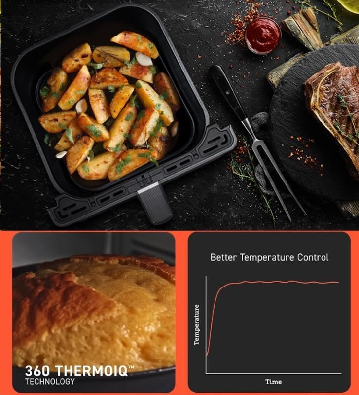 S horkovzdušnou fritézou COSORI CAF-P583S SMART si můžete užít vaše oblíbená smažená jídla bez výčitek, protože na rozdíl od běžného smažení nebo fritování je v této horkovzdušné fritéze možné připravovat jídla za použití velice malého množství oleje nebo vůbec žádného. Patentovaná technologie THERMO IQ 360° HEAT CIRCULATION přesně reguluje teplotu inteligentním teplotním algoritmem a zajišťuje tak rovnoměrně uvařené jídlo bez nutnosti jeho protřepání nebo překlápění. Kombinace cirkulujícího horkého vzduchu, dokonalé teploty vaření a chytrých programů zajistí, že hranolky budou vždy krásně křupavé a kuřecí stehna šťavnatá. Programy si můžete rychle a pohodlně nastavit také přes smartphone nebo Amazon Alexa a Google Assistant. Až budete mít hotovo, čištění bude stejně snadné díky nepřilnavému koši, který lze mýt v myčce. Díky veliké nádobě s objemem 6,4l navíc dokážete rychle navařit i pro větší rodinu nebo skupinu hostů.