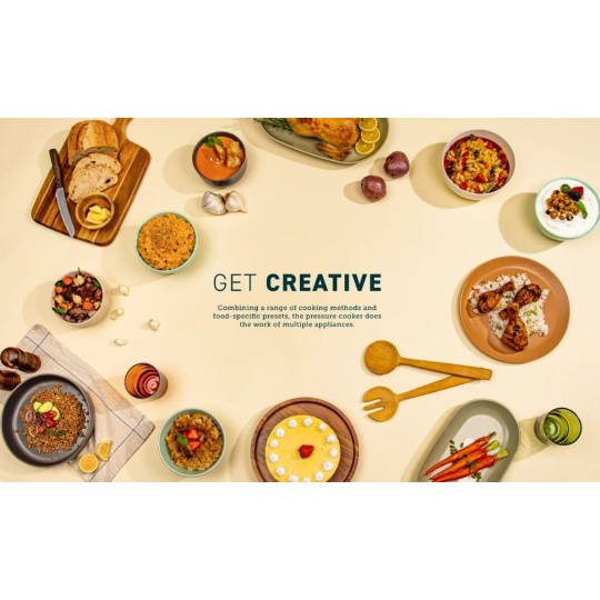 - Tlakové vaření, rýže, pára, ovesné vločky/kaše, dušené maso/vývar, fazole/zrno, maso/drůbež, jogurt, koláč, pomalé vaření, soté, Sous Vide, udržování teploty