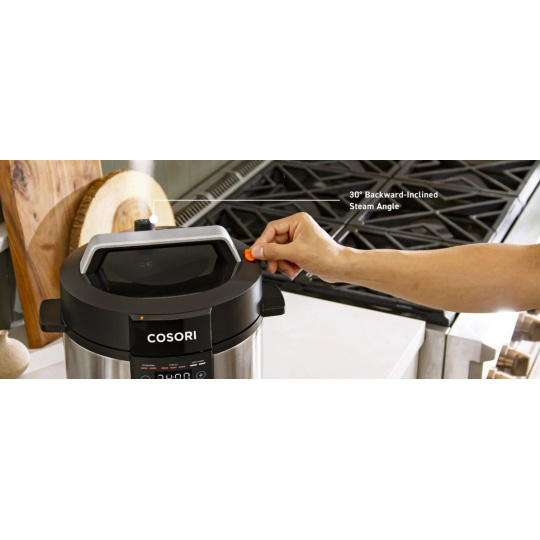 Tlačítko Seal/Vent je umístěno mimo ventil pro vypouštění páry, zatímco ovladač pro vypouštění páry je umístěn o 30° vzadu, což zajišťuje bezpečné a snadné odvětrání. Tlakový hrnec Cosori Multicooker CMC je vybaven dvouvrstvým víkem proti opaření a ochranou proti přehřátí pro větší bezpečnost