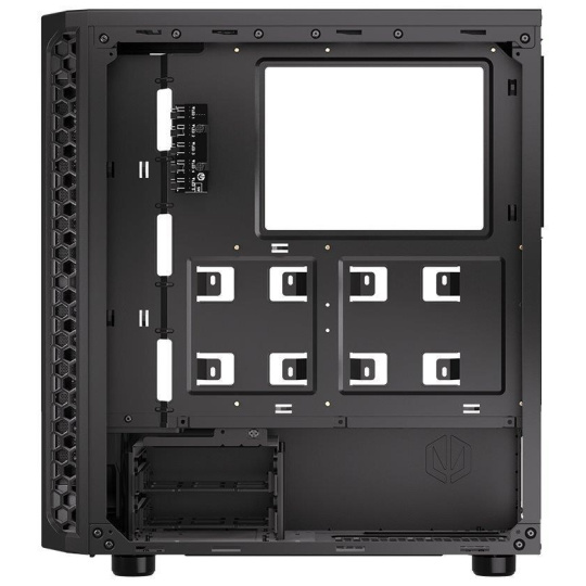 Skříň formátu Middle Tower s průhlednou bočnicí z tvrzeného skla nabízí dvě 2,5" pozice pro SSD disky a dvě 3,5" pozice pro pevné disky. Na horní části se nachází dva USB 3.0 porty, sluchátkový výstup a audio vstup pro mikrofon. Vybavena je čtyřmi 120 mm ventilátory s ARGB podsvícením, které spolu s perforovaným čelním panelem zajišťují dostatečné proudění vzduchu. Důmyslné řešení umožňuje pohodlné umístění až 360 mm dlouhého výměníku vodního chlazení na přední straně. Ve skříni je dostatek prostoru pro chladič CPU do výšky až 161 mm a grafickou kartu o délce až 350 mm. Dodávána je bez zdroje. Součástí je také sada prachových filtrů.