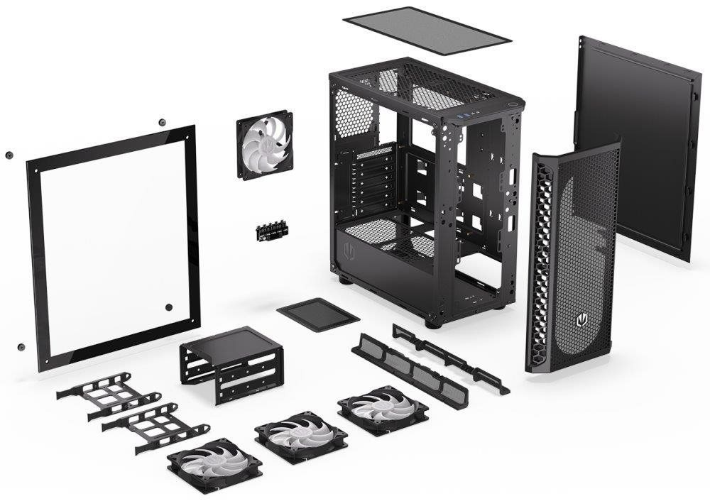 Skříň formátu Middle Tower s průhlednou bočnicí z tvrzeného skla nabízí dvě 2,5" pozice pro SSD disky a dvě 3,5" pozice pro pevné disky. Na horní části se nachází dva USB 3.0 porty, sluchátkový výstup a audio vstup pro mikrofon. Vybavena je čtyřmi 120 mm ventilátory s ARGB podsvícením, které spolu s perforovaným čelním panelem zajišťují dostatečné proudění vzduchu. Důmyslné řešení umožňuje pohodlné umístění až 360 mm dlouhého výměníku vodního chlazení na přední straně. Ve skříni je dostatek prostoru pro chladič CPU do výšky až 161 mm a grafickou kartu o délce až 350 mm. Dodávána je bez zdroje. Součástí je také sada prachových filtrů.