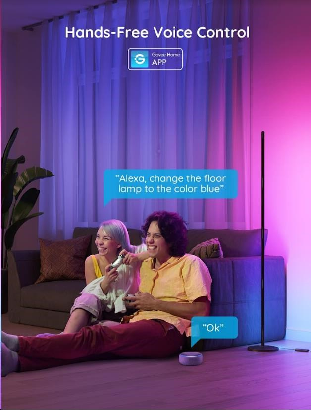 Lampička Govee Smart Corner Floor Lamp je kompatibilní s asistenty Alexa, Google Assistant a Siri. Nyní můžete Govee Smart Corner Floor Lamp zapnout/vypnout, upravit úrovně jasu nebo změnit jejich barvu pomocí hlasových příkazů z pohodlí své pohovky nebo postele. Ovládat lampu je možné také přímo na panelu nebo přes aplikaci ve vašem smartphonu nebo tabletu.