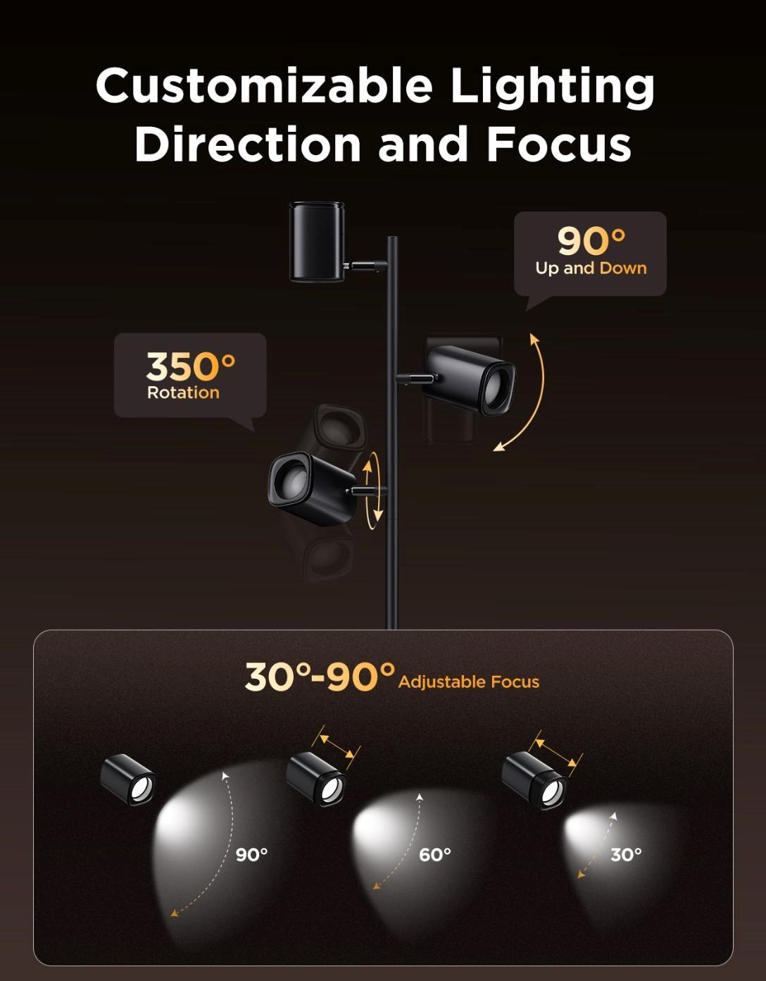 Plně nastavitelné ramena a hlavice umožňují dosáhnout dokonalého osvětlení. Lampy mají ostření v rozmezí 30°–90° pro rozptýlené nebo koncentrované světlo. Ramena se otáčejí 350° horizontálně a 90° vertikálně. To vám dává možnost přesného nasvícení každého kouta vaší místnosti.